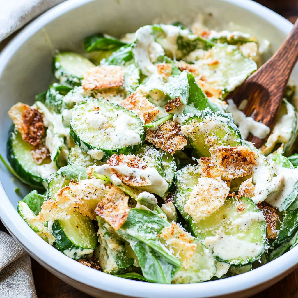Cucumber Caesar Salad is a refreshing twist on traditional Caesar salad that combines crisp cucumber slices with creamy dressing and savory toppings.